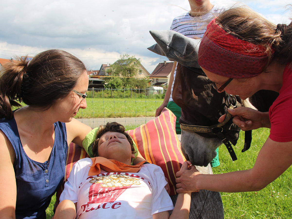 Wie bei Vanessa. Die 19-Jährige leidet unter einer ausgeprägten Spastik, die ihren ganzen Körper in Spannung hält. Ihre Hände sind oft so verkrampft, dass selbst einfache Bewegungen unmöglich erscheinen. Bis Mia zu ihr kommt. Die sensible Eselin stupst sie vorsichtig mit ihren weichen Nüstern an und erkundet behutsam ihre Hände. Und plötzlich lösen sich die verkrampften Finger ein wenig. Vanessa berührt das Fell und wagt ein paar winzige Streicheleinheiten. Mia spürt Vanessas Unsicherheit und reagiert darauf mit Feingefühl. Sie bleibt einfach da: neugierig, sanft und offen. So kann Vanessa einen Moment der Selbstwirksamkeit, ein Stück Freiheit, einen Hauch von Normalität erleben.